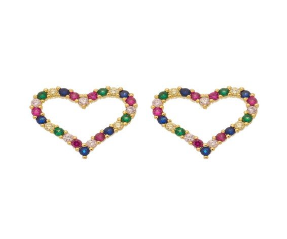 | Brinco Coração Vazado com Zircônias Coloridas, Banhado em Ouro 18K |