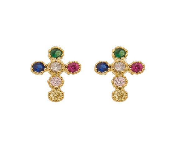Brinco Cruz Zircônias Coloridas, Banhado em Ouro 18K