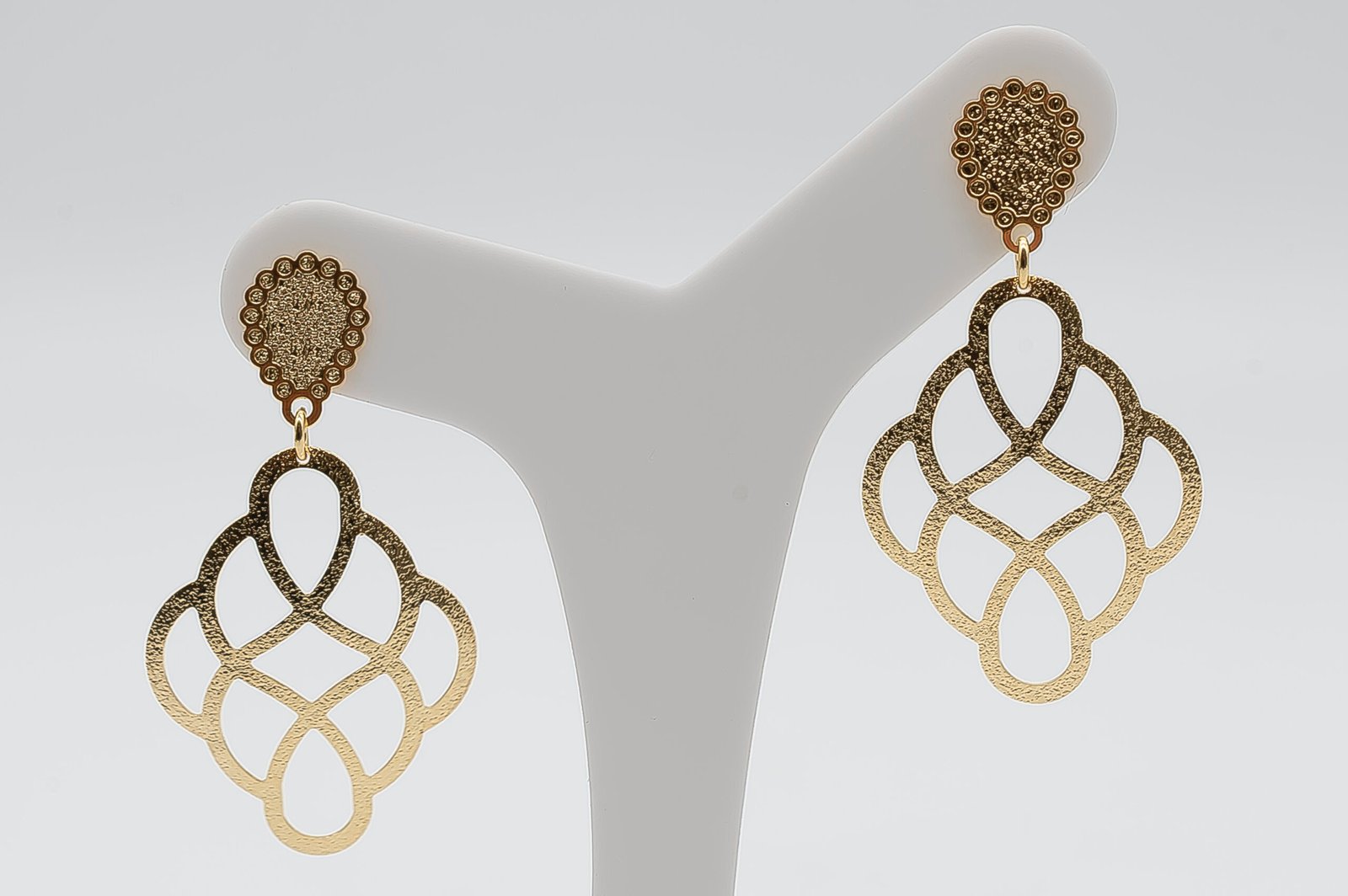 | Brinco Folha Vazada em Elos Geométricos, Banhado em Ouro 18K |
