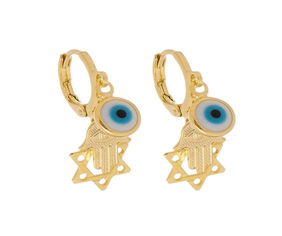 | Brinco Mini Argola com Olho Grego, Mão de Fátima e Estrela de Davi, Banhado em Ouro 18K |