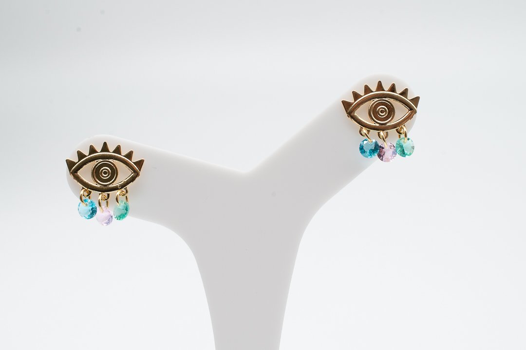 | Brinco Olho Grego Liso com Zircônias Coloridas Penduradas, Banhado em Ouro 18K |