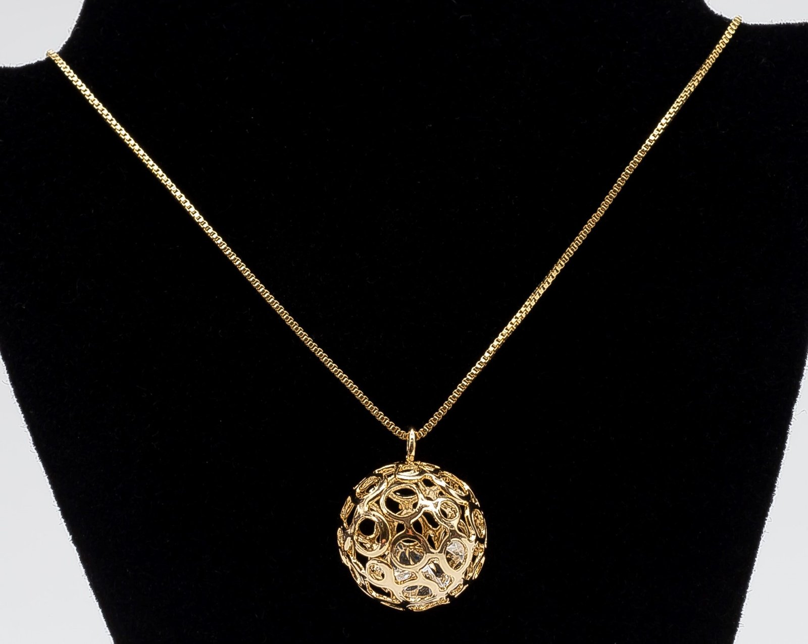 | Colar Bola Vazada com Zircônias no Interior, Banhado em Ouro 18K |