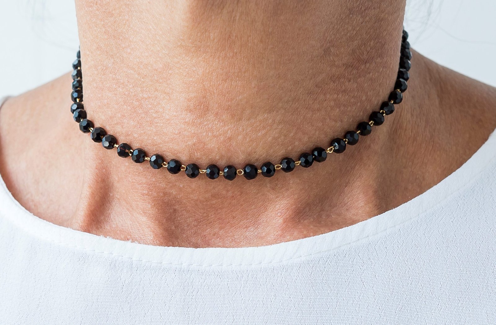 | Colar Choker Zircônias Pretas Redondas, Banhado em Ouro 18K |
