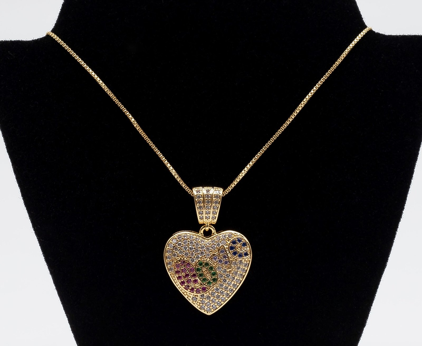 | Colar Coração Love Cravejado Zircônia Colorida e Cristal, Banhado em Ouro 18K |