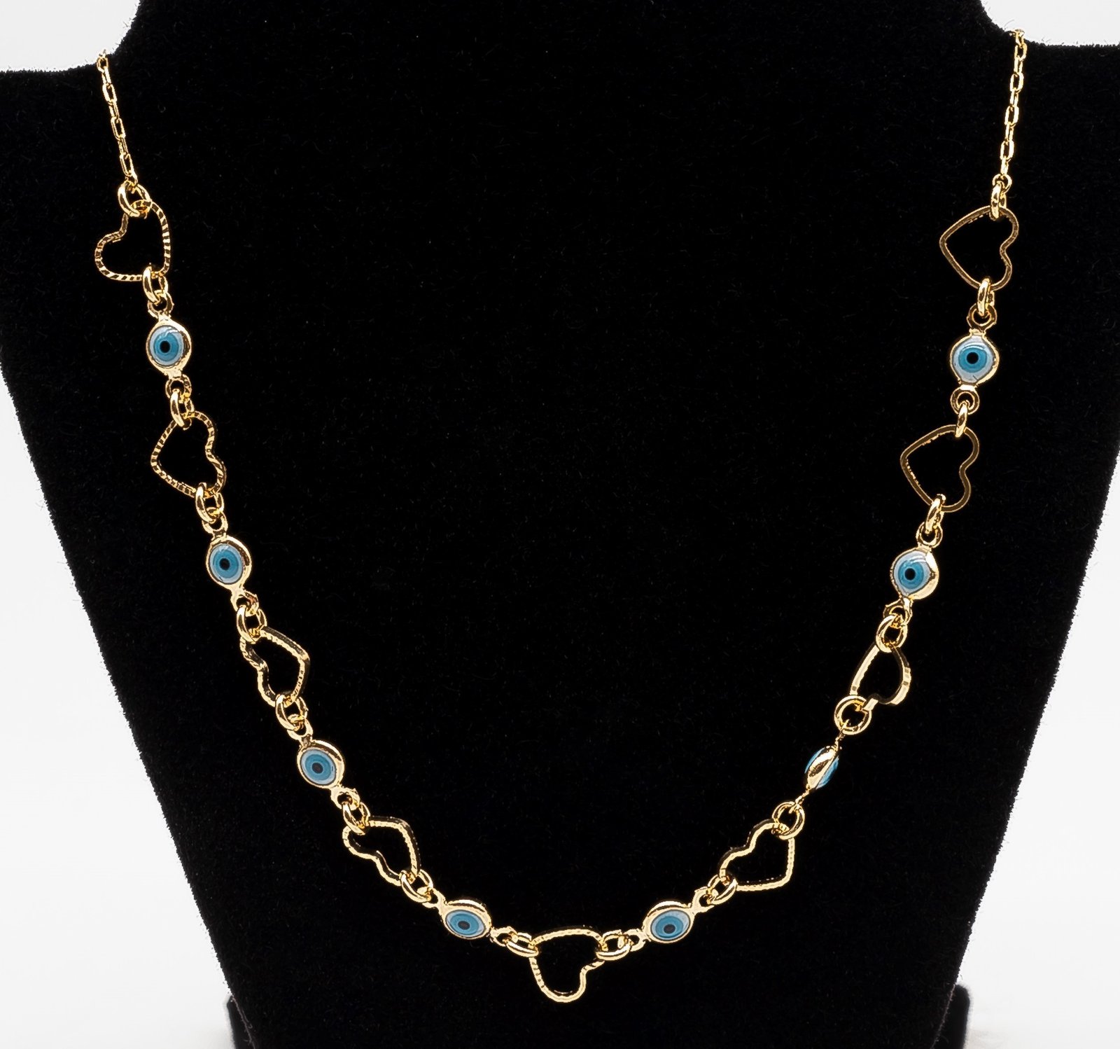 | Colar Corações Intercalados com Olhos Gregos, Banhado em Ouro 18K |