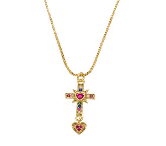 | Colar Cruz com Corações e Zircônias Coloridas, Banhado em Ouro 18K |