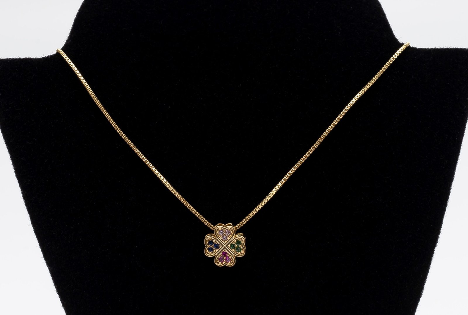 | Colar Mini Trevo com Zircônias Coloridas, Banhado em Ouro 18K |