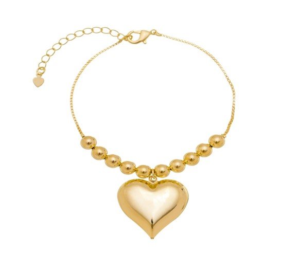 | Pulseira com Bolas e Pingente de Coração Liso, Banhado em Ouro 18K |