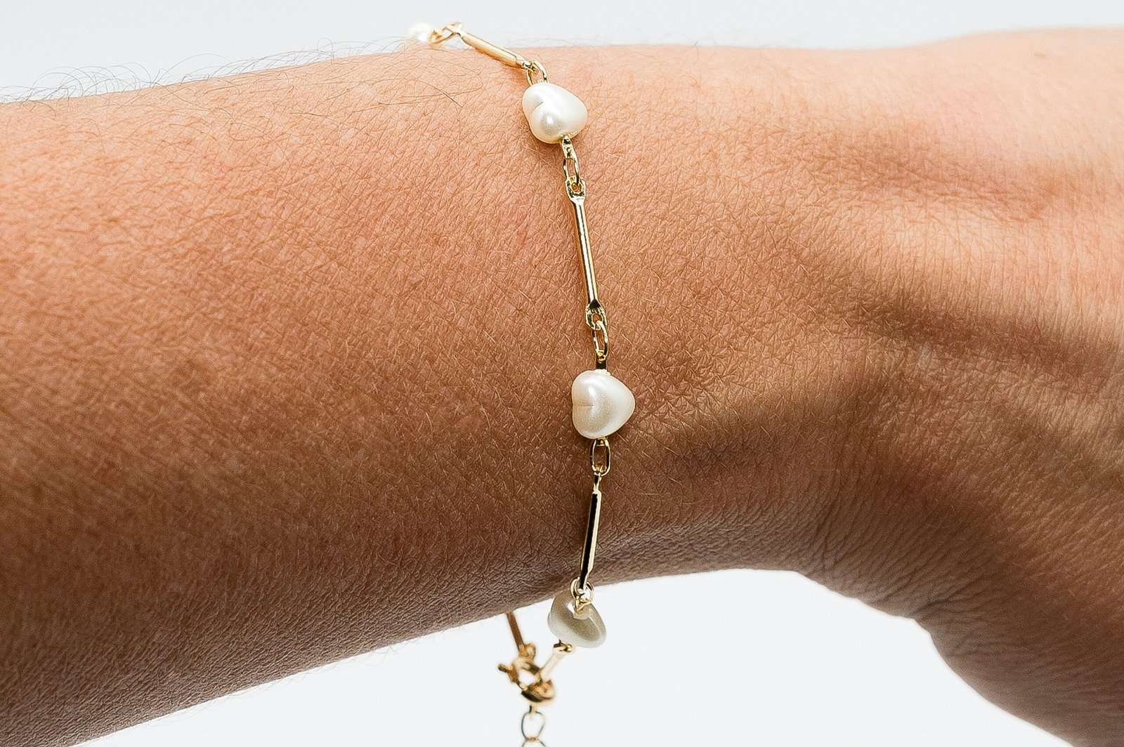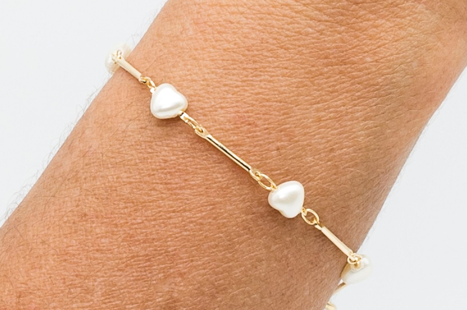| Pulseira Corrente Reta com Pérolas de Coração, Banhada em Ouro 18K |