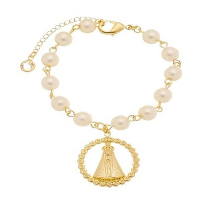 | Pulseira de Pérolas com Pingente Circular com Santa, Banhada em Ouro 18K |