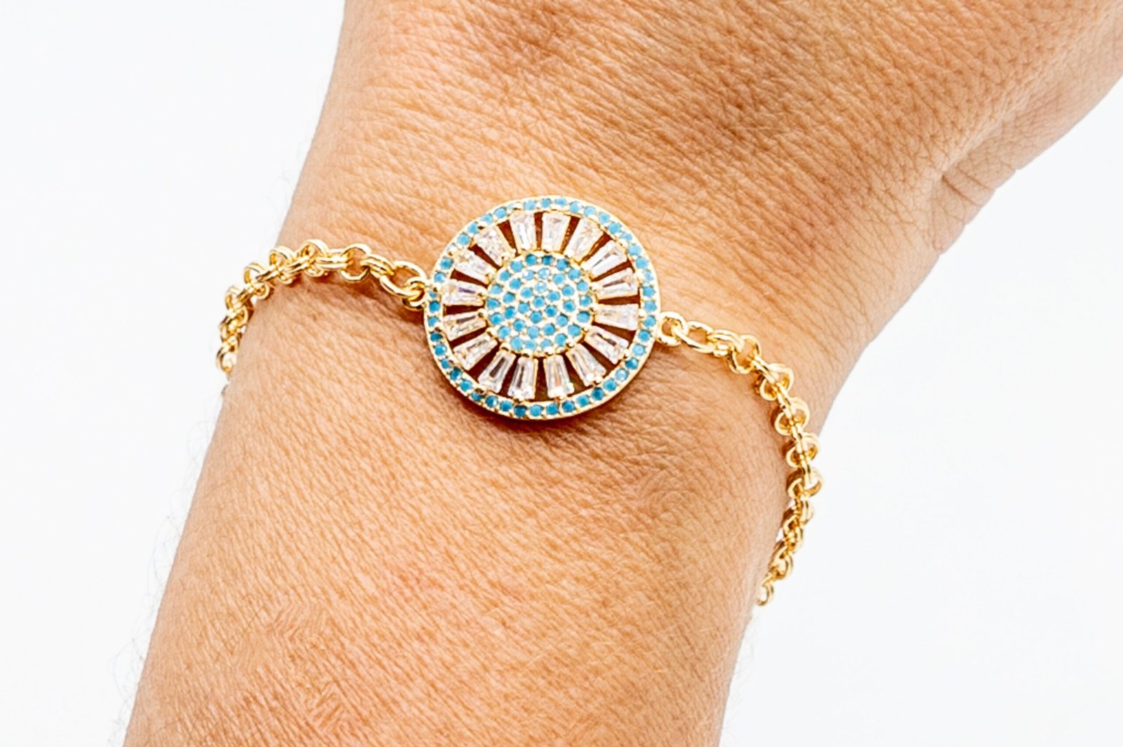 | Pulseira Roda Cravejada Zircônia Azul e Cristal, Banhada em Ouro 18K |