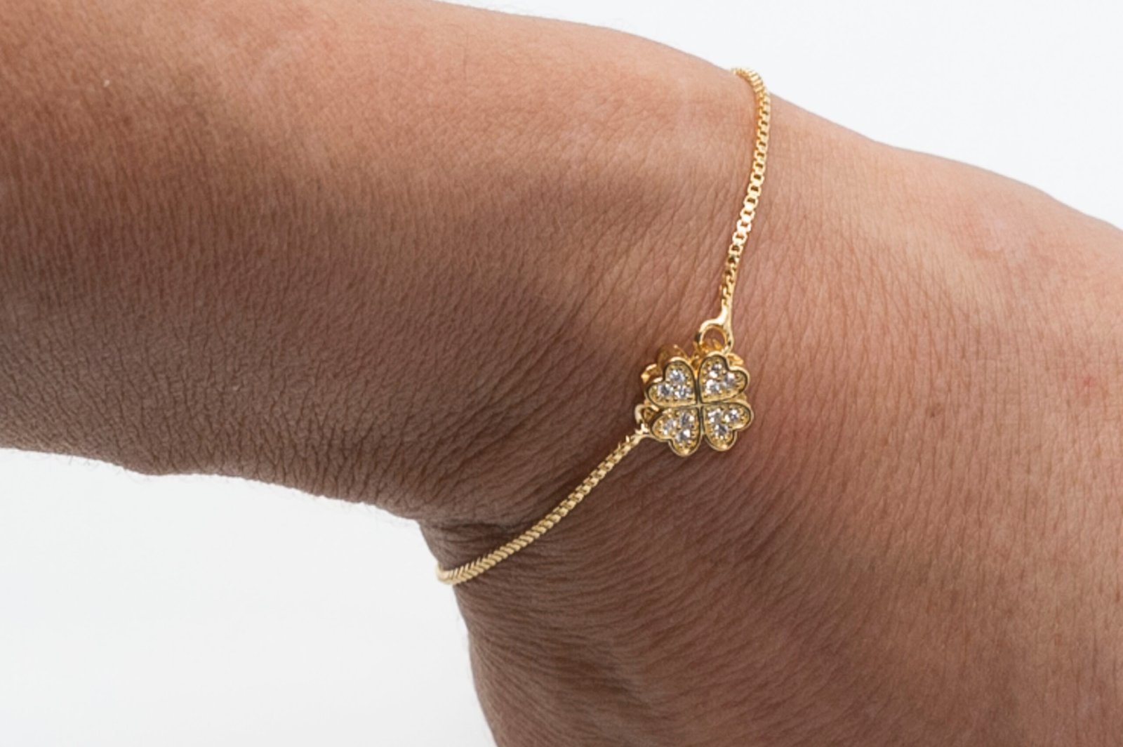 | Pulseira Trevo Cravejado Zircônia Cristal, Banhado em Ouro 18K |