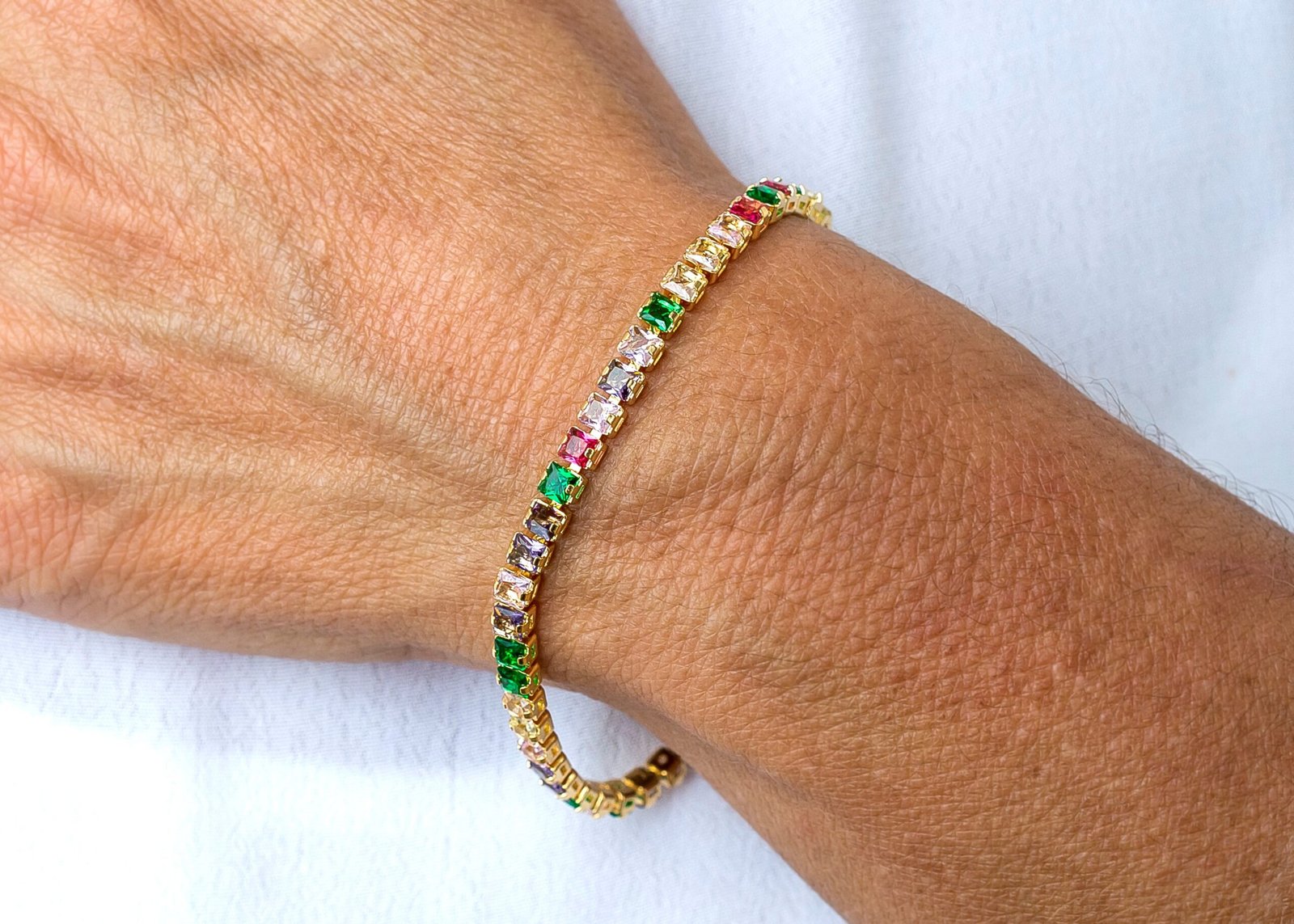 Pulseira Zircônias Coloridas Quadradas, Banhada em Ouro 18K